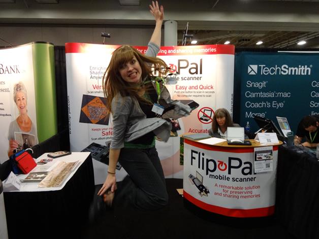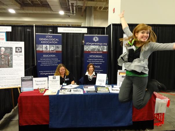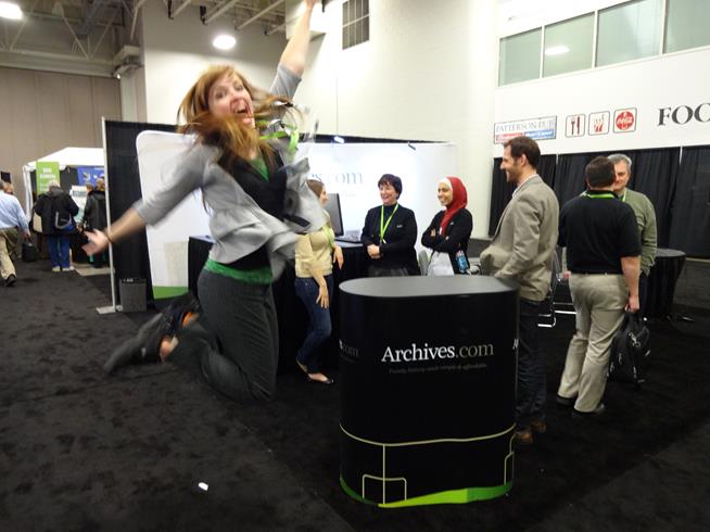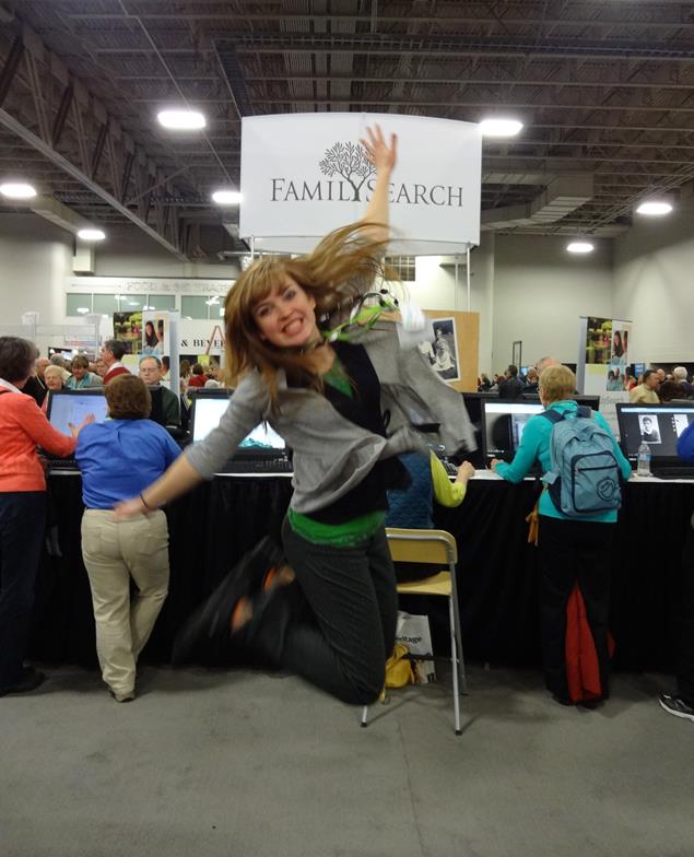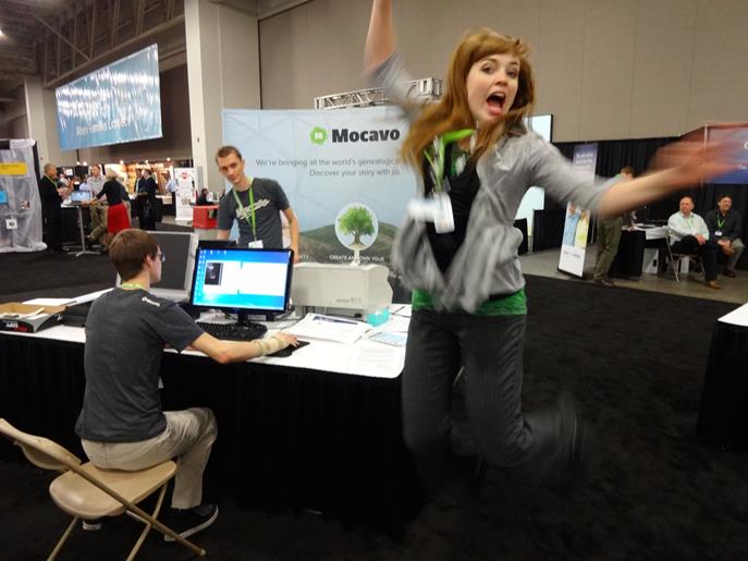 The lovely waterfall/sign that greeted us every morning when we walked into the Expo hall.Gotta love Ancestry.com!Find My Past: their booth was so tall!I LOVED meeting these lovely Aussies (Alona Tester in the hat behind me is a blogger too!) I can’t help being jealous of her lovely accent.These people loved the fact that it looked like they were photo-bombing me, when really, I was sneakily getting the picture of them!I heard lots of great things about RootsMagic this weekend, I may just have to try them out myself!Mocavo provided the green lanyards for ALL conference attendees!MyHeritage has some exciting things coming up! Can’t wait to try out the free 6 month membership I won from them!The My Heritage side-note we got to look at all day (our booth was right next door). I have the gift of levitation everyone.Everyone loves FamilySearch here!Flip-Pal has a ROCKIN’ product. Might just have to rob my piggy bank to get myself one!Saving Memories Forever; I already have their app on my phone!I think these two lovely ladies weren’t sure what to think of me…Yes, folks, this is the only booth that applauded my jumping skills. Thanks Southern California Geneological Society!ReelGenie was packing up their booth by the time I got to theirs… I had to jump real fast!And then I found someone to jump with me! I love these Sistas in Zion! What great sports!…and we ended big with one big BillionGraves JUMP. These guys are the best!